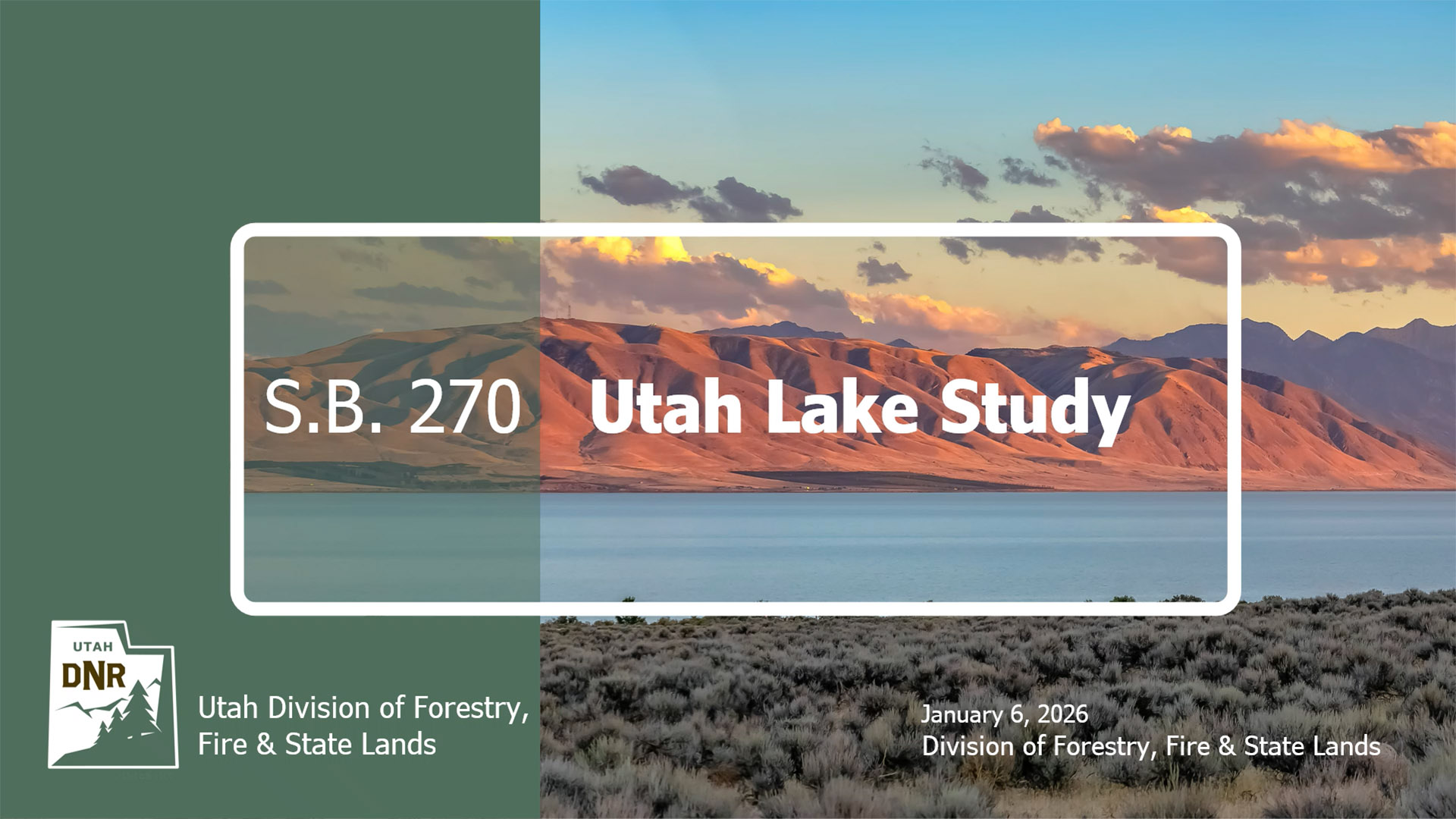 With the passage of Senate Bill 270 “Utah Lake and Great Salt Lake Study Amendments” during the 2024 Utah Legislative Session, the Division of Forestry, Fire and State Lands (FFSL) is conducting a study to determine how to enhance benefits associated with Utah Lake in a manner consistent with the FFSL’s management authority over sovereign lands.